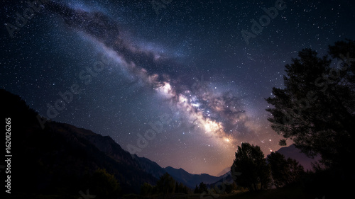 Impresjonujący widok Drogi Mlecznej na nocnym niebie nad naturalnym krajobrazem Ziemi. Gwiezdna panorama ukazująca piękno kosmosu i nieskończoność wszechświata.