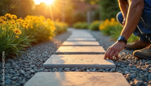 Garden path with stone pavers, bright sunlight filtering through yellow flowers. Natural landscaping detail shows zen garden design with gravel base. Peaceful backyard setting features tranquil green