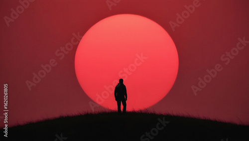 Person in Silhouette on a Hill with a Bright Red Sun male standing