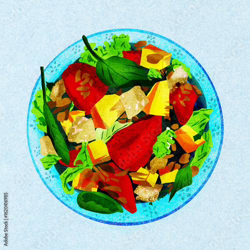 Ilustracja niebieski talerz sałatka owocowa truskawki sałata ser.