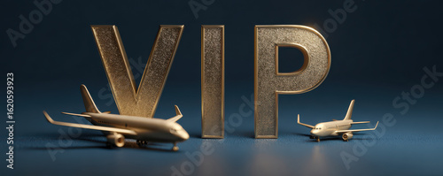 Golden VIP letters flanking airplane models symbolize exclusive travel experiences or aviation privilege