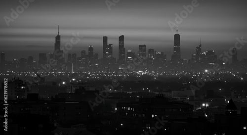 Moody black and white panorama of a major city skyline with illuminated skyscrapers seen through atmospheric haze at night.