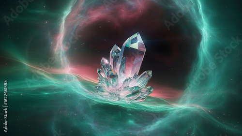 Large crystal cluster floating in colorful nebula clouds and starry outer space