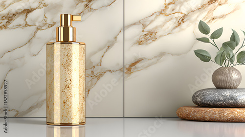 Luxurious facial essence bottle with gold pump sits elegantly on reflective surface, complemented by marble background and decorative stones, creating serene spa like atmosphere