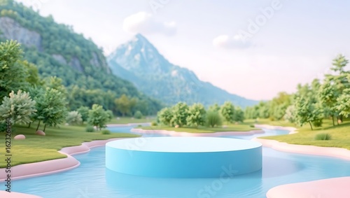 Serene mountain landscape with circular platform on water