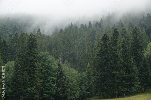 Zbocze góry porośnięte gęstym lasem otulonym gęstą mgłą