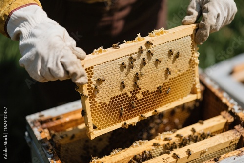 Macro Shot of Hands Harvesting Honeycomb Frame