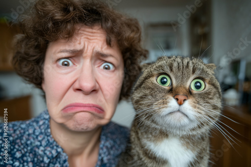 A woman with curly hair shows a shocked expression, while a tabby cat beside her has wide eyes and a startled look. The background is softly blurred.