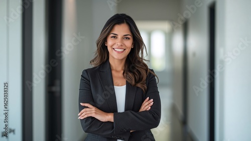 Sonriente gerente, abogada o consultora de pie en el interior de un edificio corporativo con fondo desenfocado. Imagen de una empleada ambiciosa y amigable lista para el éxito y el crecimiento laboral