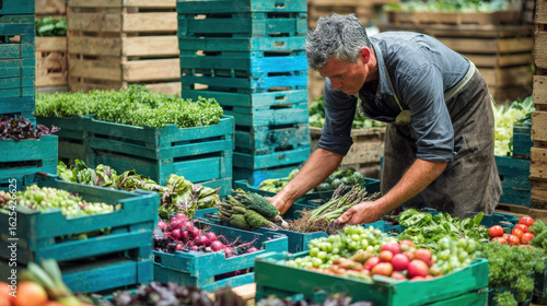 Man arranging fresh vegetables in wooden crates at an outdoor farmers market surrounded by colorful produce in a rustic and organic setting