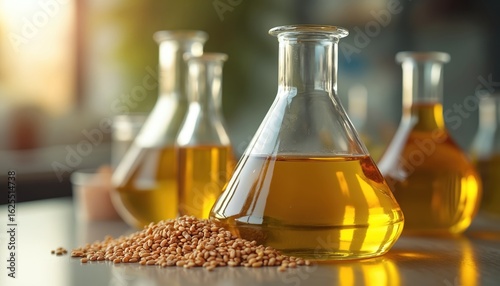 Golden vegetable oil extraction process analyzed in lab. Grains and amber liquid in beakers and flasks represent agriculture industry science, research, and food processing.