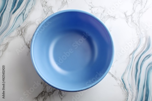 A marble countertop provides the backdrop for a bright blue mixing bowl that showcases unpretentious kitchenware with a classy design intended for the kitchen