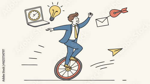 Businessman Balancing Act: Unicycle, Laptop, Ideas, and Email Marketing Concept Illustration.
