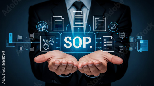 Professional presenting a glowing digital interface displaying sop and various document icons representing standardized operating procedures