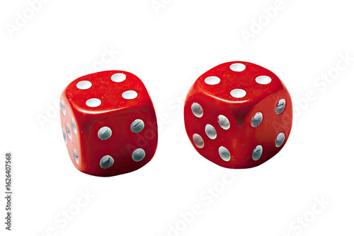 Two red dice, side-by-side, against a black background. The dice are a glossy, smooth finish, with white pips, showing a random number on each die