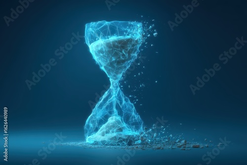 A glowing digital hourglass made of blue lines and particles, partially disintegrating, symbolizes the passage and fragility of time