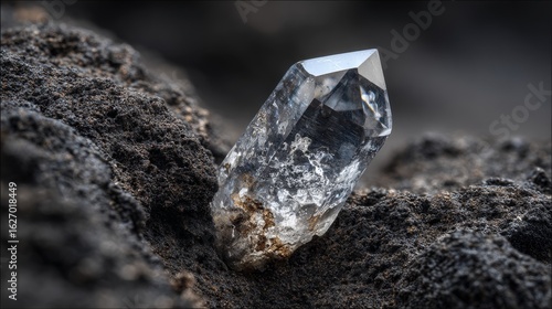 A clear quartz crystal emerging from a fissure in dark basalt rock, its geometric form contrasting with the amorphous volcanic texture.