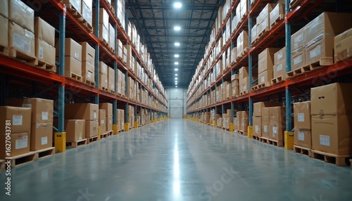 Vast warehouse interior filled with tall shelves stacked high with cardboard boxes. Bright overhead lighting illuminates polished concrete floors, organized storage aisles, indicating efficient