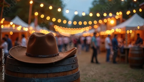 Brown cowboy hat rests on wooden barrel at outdoor festival. Blurred background shows people, tents, and warm string lights creating a festive evening ambience.