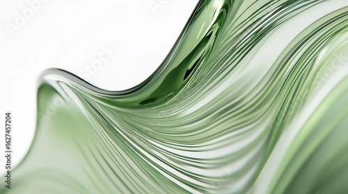 Close-up of green glass with elegant wavy lines on white background, highlighting smooth curves, reflective texture, and natural beauty of the material