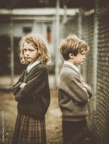 School children standing back to back, crossing arms, feeling angry