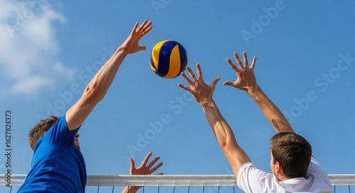 Two volleyball players jumping at the net to block a ball against a bright blue sky with scattered clouds. Action, sport, and summer competition