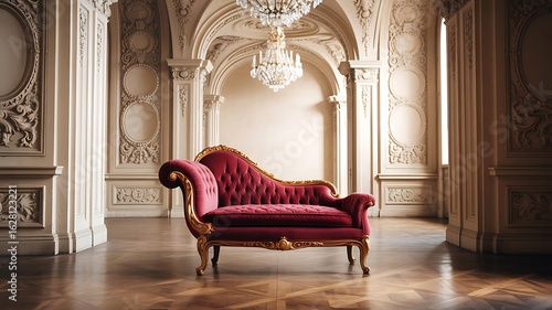 Elegant chaise lounge in a luxurious room with chandelier and arch
