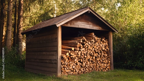Side view of a simple wooden shed holding firewood, with chopped logs extending out, highlighting natural outdoor elements