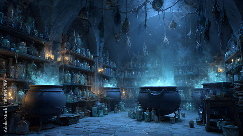 A background of a witch’s potion room filled with bubbling cauldrons, shelves of spell books, potion bottles, and eerie blue lighting, magical and spooky