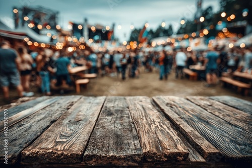 Rustic wooden table at a crowded outdoor festival