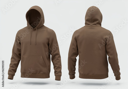 Brown hoodie shown from front and back on a white background for casual wear branding or hoodie design template.
