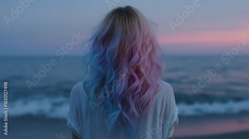 Woman with vibrant colorful hair staring out towards the ocean at dusk