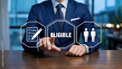Professional businessman selects 'eligible' status, reviewing checklist and team icons on digital interface