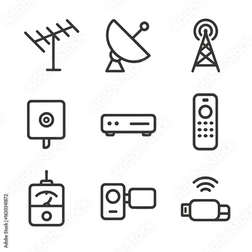 TV Equipment Icons. Outline icon set of television transmitters: TV antenna, satellite dish, broadcast tower, cable transmitter,