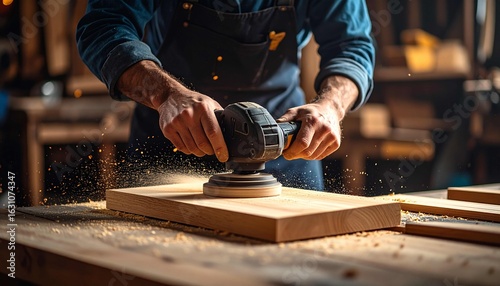 A woodworker or craftsman sands a wooden surface with an orbital sander. Sawdust flies through the air, indicating an active and detailed work process.,close up of a man playing chess