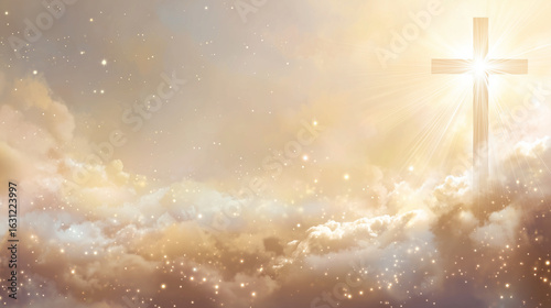 All Saints' Day, Soft ivory to light gold gradient, 3D glowing cross with rays of light, heavenly sky background