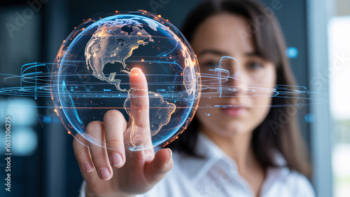 Woman's finger touching a digital Earth with glowing network lines image photo