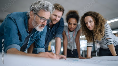 A team of four colleagues collaborating over blueprints, demonstrating a focused approach
