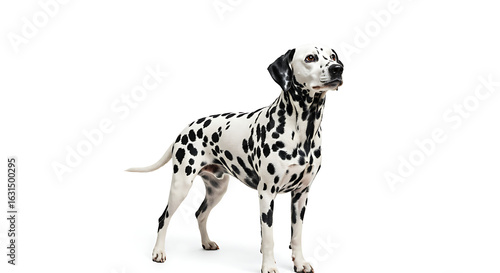 Dalmatian dog standing on white background with its iconic black spots and curious look