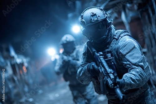 Group of equipped soldiers advancing through dark urban environment at night using tactical flashlights and holding assault rifles, performing a dangerous military operation