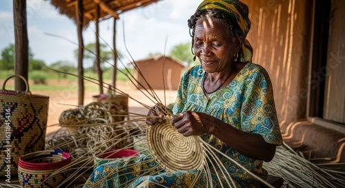Senior African woman weaving traditional baskets in rural setting, showcasing cultural heritage and sustainable craftsmanship