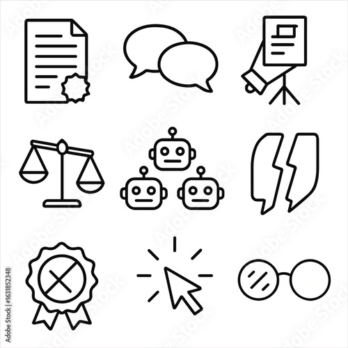 Misinformation Icons Collection. Outline style icons of Misinformation: forged document seal, echo bubble repeat, agenda spotlight