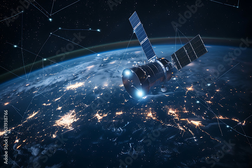 宇宙から見た地球と通信衛星の未来的テクノロジー構図
