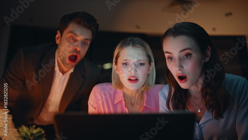 Office managers losing deal shocked on business news laptop late evening closeup