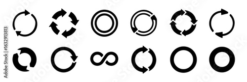 A collection of black and white vector icons depicting various circular arrows, refresh symbols, loading indicators, and an infinity sign, representing concepts of repetition, cycle, and continuous