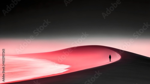 A single person silhouetted against the dramatic pink and red hues of a desert landscape walking along a winding path through the undulating sand dunes