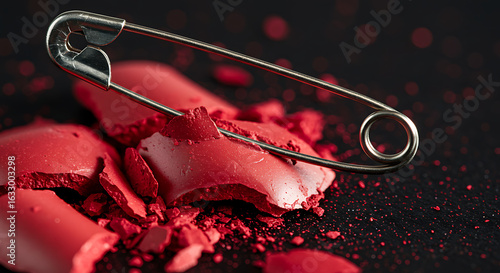 Conceptual still life with a crushed red lipstick and a metal safety pin, symbolizing edgy rebellion and unconventional beauty.