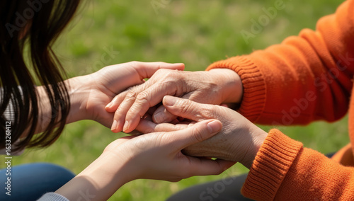 손을 맞잡고 있는 젊은 여성과 노인의 손, 세대 간의 따뜻한 손길과 사랑