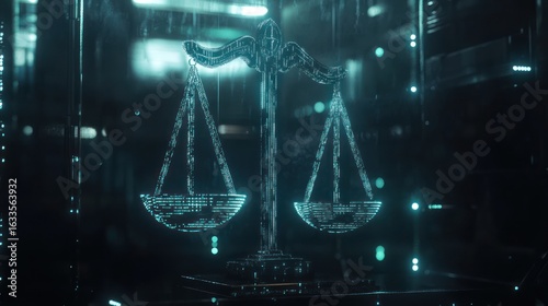 Digital scales of justice within a glass enclosure, bathed in ethereal teal-and-aqua light, with blurred city lights and rain streaks visible through the glass