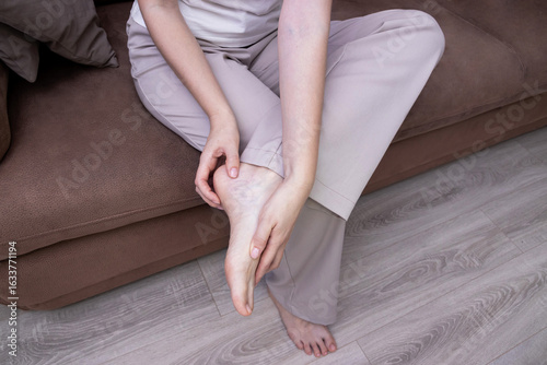 Sore feet after standing too long. Woman sitting, massaging painful foot. Concept of leg pain, foot fatigue, restless leg syndrome.